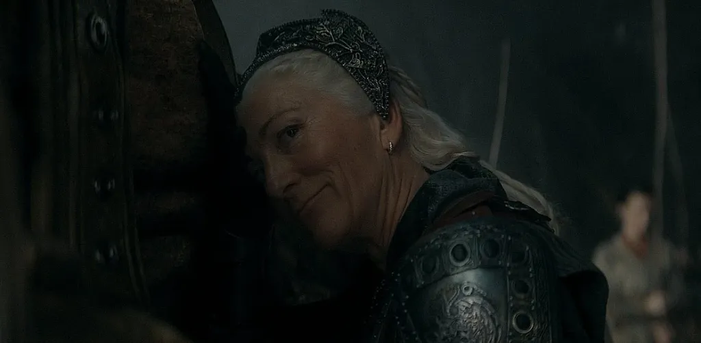 O arco da Alicent por exemplo, que pode ser visto como um paralelo com a Carminha logo após ter sido desmascarada, está perdida, desolada. Tentando agora encontrar um propósito, ela vê como Rhaenyra se sentiu ao enfrentar um reino comandado por homens. E com isso também entra o dilema moral de um relacionamento com o personagem odiado por todos, Criston Cole.